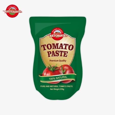Le sachet stand-up est composé de 250 g de pâte de tomate douce et épicée avec une pureté allant de 30% à 100%