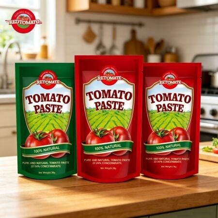 La pochette refermable est fabriquée à partir d'un matériau flexible qui peut se tenir debout indépendamment, facilitant le stockage et la manipulation sans effort. Ce format d'emballage garantit la fraîcheur et la protection du concentré de tomate jusqu'à son utilisation.